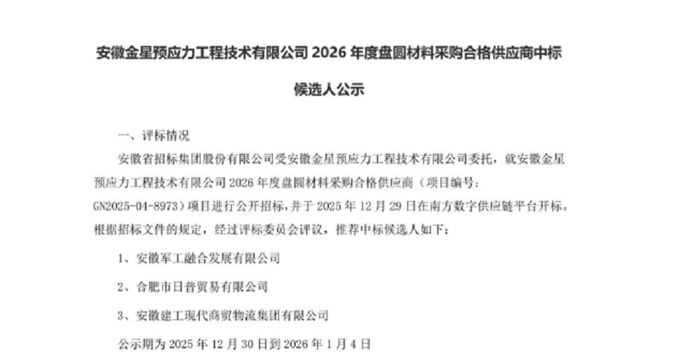 建工商貿(mào)物流成功中標金星預應(yīng)力2026年度盤圓集中采購